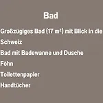 Апартаменты Schweizerblick включают в себя такие удобства, как звуконепроницаемые окна, а также патио и зона отдыха. Эти апартаменты состоят из 2 спален, 1 ванной комнаты и кухни. В спальнях предусмотрены пуховые подушки и пухо-перьевые подушки. В спальне предоставляются пуховые подушки и пухо-перьевые подушки. В ванной комнате есть биде, отдельный туалет и ванна, а также предоставлена сушилка и полотенца.